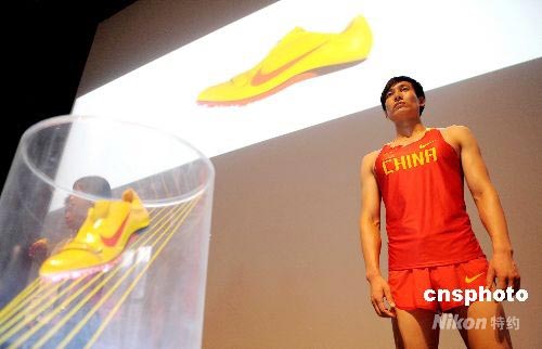 7月31日下午,劉翔的奧運(yùn)戰(zhàn)靴、戰(zhàn)袍亮相京城。此次劉翔征戰(zhàn)奧運(yùn)所穿的這款戰(zhàn)靴、戰(zhàn)袍均含有當(dāng)今世界最高科技成分,將有助于劉翔在“鳥(niǎo)巢”創(chuàng)造佳績(jī)。 中新社發(fā) 陳文 攝