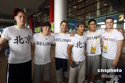 7月31日,美國男子體操隊(duì)飛抵北京,在北京首都國際機(jī)場T3航站樓前身著印有“北京”字樣的T恤衫合影。右一為摩根·哈姆,右二為華裔體操選手譚凱文(Kevin Tan)。 中新社發(fā) 杜洋 攝