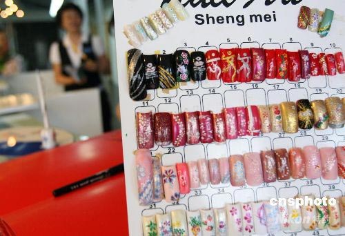 北京奧運會開幕在即,奧運村國際區(qū)美發(fā)沙龍?zhí)峁┯小爸袊 眻D案的美甲服務(wù),別有中國特色。中新社發(fā) 武仲林 攝
