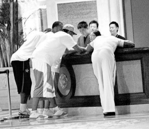 約兩小時(shí)后,4人才離開(kāi)浴室返回酒店。貴為天王巨星,4人看來(lái)比打一場(chǎng)球賽更加疲累,在詢(xún)問(wèn)處查詢(xún)時(shí),竟然不顧身份,旁若無(wú)人地趴在詢(xún)問(wèn)處柜臺(tái)上休息。直至酒店職員安排好,4人才不情愿地站起身返回房間。據(jù)悉,極受球迷歡迎的安東尼離開(kāi)浴室時(shí),雙手在自己身上做出不雅動(dòng)作。