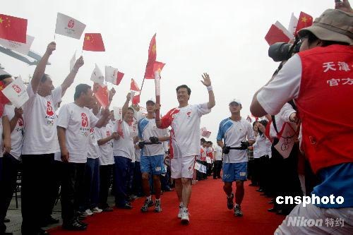 8月1日,奧運火炬在天津濱海新區(qū)傳遞,起跑點設(shè)在天津港集裝箱碼頭。圖為“藍領(lǐng)專家”孔祥瑞擔(dān)任首棒火炬手傳遞奧運火炬。 中新社發(fā) 田齊 攝