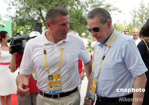 國際奧委會主席羅格與國際奧委會運動員委員會主席、前世界著名撐竿跳高運動員謝爾蓋·布勃卡(左)在一起交談。 中新社發(fā) 杜洋 攝