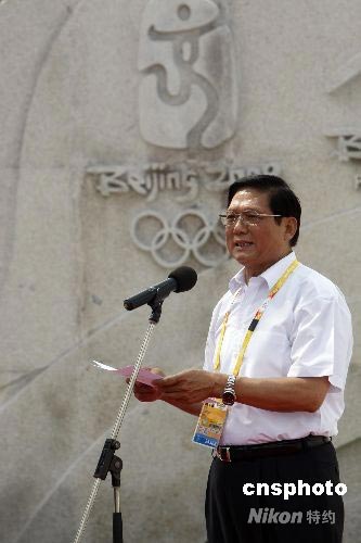 8月1日,北京奧運村“和平友誼墻”正式啟動。圖為北京奧組委主席劉淇在啟動儀式上致詞。中新社發(fā) 杜洋 攝