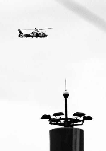 8月1日,執(zhí)行安保任務(wù)的國(guó)產(chǎn)警用直升機(jī)盤旋在北京奧運(yùn)場(chǎng)館上空。 喻志勇攝