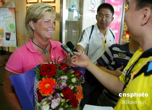 8月2日,前中國女足主教練多曼斯基(左)現(xiàn)身首都國際機場。她這次是作為瑞典足協(xié)官員來中國考察足球比賽場地。 中新社發(fā) 富田 攝