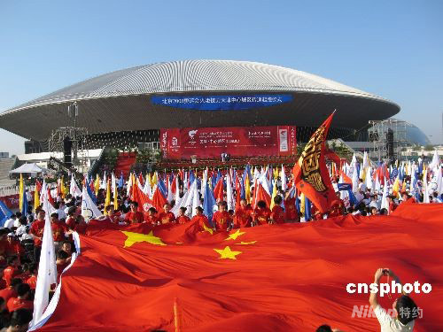 圖:天津市民手托巨幅五星紅旗祝福奧運