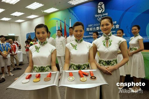 奧運(yùn)馬術(shù)禮儀小姐展示馬術(shù)比賽獎(jiǎng)牌