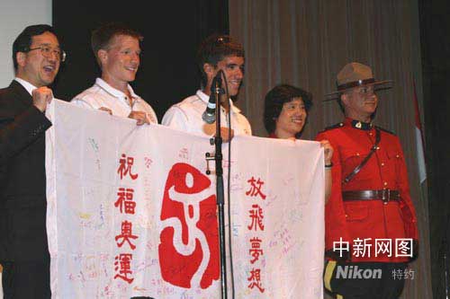 精彩的演出中,兩位陽光小伙——加拿大皮劃艇國(guó)家隊(duì)隊(duì)員,奧運(yùn)選手希爾和莫蒂默的到來讓觀眾格外興奮。而對(duì)于主持人黃源博士精心準(zhǔn)備的加試——“筷子夾乒乓球”,他們輕松過關(guān),獲得了在場(chǎng)所有人簽名祝福的奧運(yùn)五環(huán)旗這一特別禮物。他們也表示將會(huì)帶著大家的祝愿,盡最大努力實(shí)現(xiàn)目標(biāo)。
