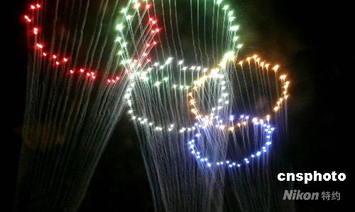 圖:北京天安門廣場首次試放“五環(huán)”禮花