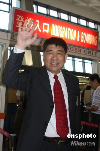 8月3日7時55分,由總領(lǐng)隊蔡賜爵等率領(lǐng)的中華臺北代表隊一行50人,搭乘華航CI603班機經(jīng)香港轉(zhuǎn)機前往北京,征戰(zhàn)2008年北京奧運會。圖為蔡賜爵在桃園機場登機入口處,他在行前向中新社記者表示,中華臺北隊此次的目標是,最起碼要保持雅典奧運的2金2銀1銅。 中新社發(fā) 董會峰 攝