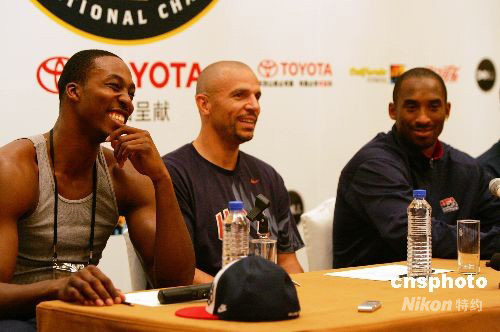 8月2日,巨星云集的美國國家男籃抵達(dá)上海,備戰(zhàn)即將進(jìn)行的北京奧運(yùn)會。他們將在滬與俄羅斯、澳大利亞男籃進(jìn)行兩場比賽,為奧運(yùn)熱身。當(dāng)日,美國男籃主教練與部分球員出席媒體見面會,回答中外媒體提問。圖為左起德懷特·霍華德 (Dwight Howard)、賈森·基德 (Jason Kidd)、科比·布萊恩特 (Kobe Bryant)在輕松回答記者提問。中新社發(fā) 湯彥俊 攝