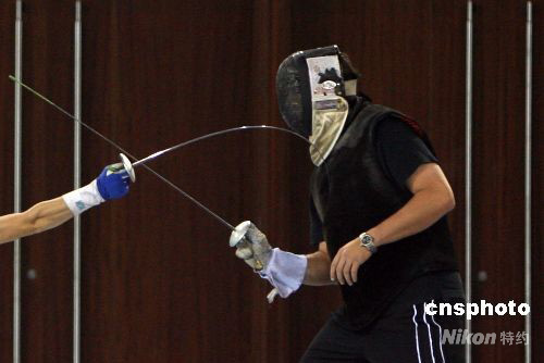 8月3日,兩名運動員在北京國際會議中心擊劍館進(jìn)行賽前訓(xùn)練,備戰(zhàn)即將揭幕的北京奧運。 中新社發(fā) 武仲林 攝