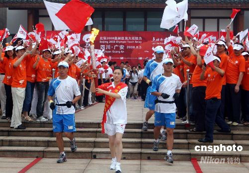 8月3日,奧運(yùn)圣火開(kāi)始在四川傳遞,抗震英模蔣敏跑出廣安傳遞首棒火炬。彭州市公安局光明路派出所教導(dǎo)員蔣敏在“5·12”汶川大地震中,痛失10位親人仍然頑強(qiáng)奮戰(zhàn)在抗震救災(zāi)的第一線、感動(dòng)了億萬(wàn)中國(guó)人、被授予一級(jí)英模、被網(wǎng)友稱為“中國(guó)最美女警”、被公安部長(zhǎng)稱贊是“全國(guó)最堅(jiān)強(qiáng)的女警花”。 中新社發(fā) 廖攀 攝