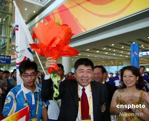 8月3日下午,中華臺北奧運(yùn)代表團(tuán)一行50人,經(jīng)香港轉(zhuǎn)機(jī)抵達(dá)北京,征戰(zhàn)2008年北京奧運(yùn)會。圖為代表團(tuán)抵達(dá)北京后,中華臺北奧運(yùn)代表團(tuán)主席蔡賜爵受到熱烈歡迎。
