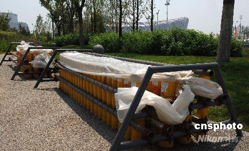 8月3日,離北京奧運會開幕還有5天,國家主體育場——“鳥巢”建筑附近做好了北京奧運會開幕式的準(zhǔn)備工作。圖為鳥巢北側(cè)布置22x4聯(lián)發(fā)禮花炮放射裝置,每一個發(fā)射裝置上均有禮花彈詳細名稱。 中新社發(fā) 鄒憲 攝