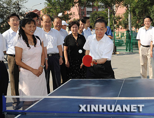 豐臺區(qū)大井社區(qū)位于豐臺體育中心一側(cè)。近年來,通過舊樓改造、建設(shè)綠地等措施,居民生活環(huán)境明顯改善。上午9時(shí)許,溫家寶一行來到這個(gè)社區(qū),看到這里樓新路寬環(huán)境美,居民還有自己的健身場所,許多人正在這里活動(dòng),他十分高興,便興致勃勃地和群眾打起了乒乓球。