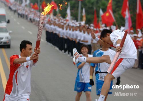 8月3日,奧運(yùn)火炬在四川廣安傳遞,火炬手周勇與畢磊交接火炬時(shí),畢磊手持祥云火炬展示起中國(guó)功夫。 中新社發(fā) 廖攀 攝