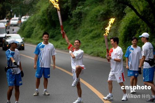 8月4日,奧運火炬在樂山峨眉山下傳遞,火炬手做起武俠造型傳遞火炬。中新社發(fā) 廖攀 攝