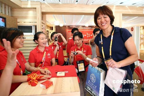 8月5日,美國(guó)女排主教練郎平在北京奧運(yùn)村紀(jì)念章交換中心內(nèi)領(lǐng)取了一件環(huán)保T恤衫和環(huán)?曜印C考⺄恤衫是用從5個(gè)500毫升裝的塑料可樂瓶中提取的纖維,再補(bǔ)充一些棉纖維做成的。 中新社發(fā) 盛佳鵬 攝