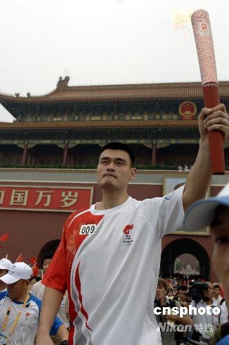 姚明傳遞第9棒火炬跑出天安門。 中新社發(fā) 王東明 攝