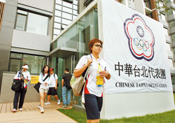 中華臺北隊的人數(shù)比較少,雖然住了1至4樓,但每個樓層只有兩個居住單位,不像對面的大陸隊占了半幢大樓,且每個窗口都掛上五星旗。中華臺北代表團也在一樓入口處外墻掛上一幅長、寬各數(shù)公尺的特大號中華臺北奧委會會旗,顯得非常醒目;經(jīng)過的人大都會駐足觀看,甚至拍照留念。