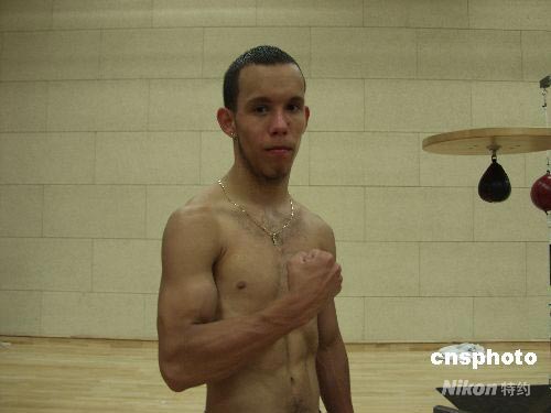 8月5日,美國(guó)拳擊隊(duì)在北京師范大學(xué)訓(xùn)練營(yíng)進(jìn)行奧運(yùn)會(huì)前的公開(kāi)訓(xùn)練。圖為奪金熱門(mén)拳手美國(guó)的路易斯·揚(yáng)耐茲正展示自己的肌肉。他也是中國(guó)選手鄒市明奪金道路上最大的攔路虎。中新社發(fā) 賴(lài)松 攝