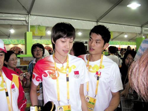 出門,兩人立刻就被“可口可樂交換紀(jì)念章”的店給吸引進(jìn)去了,結(jié)果兩人一人弄了一件免費(fèi)的環(huán)保T恤。一路上,圍觀拍照的人很多,林丹和謝杏芳很大方,不管是合影或者簽名,都來者不拒,而且絕對掛上微笑?粗鹈蚰信牭念I(lǐng)軍人物,在大賽前能有這樣的心情和心態(tài),真的很高興。對于記者的提問,林丹也不拒絕,但他說:“我現(xiàn)在不想說比賽的事兒,不過我的狀態(tài)非常好!弊∵M(jìn)了奧運(yùn)村,林丹說:“這里環(huán)境非常好,比雅典時候好!倍x杏芳微微抱怨,“就是床小了點(diǎn)兒。”