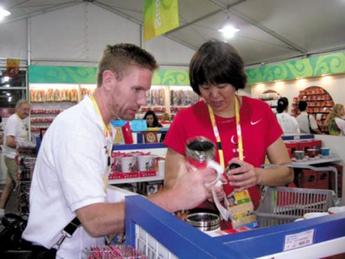 結(jié)果,廣東姑娘謝杏芳買了一大箱子的福娃茶盅,每個小小的茶盅上都有福娃頭像,一套72件。不用說,林丹提著。這下只能提前收工了,林丹迅速提了兩套福娃玩偶,還有帽子,小玩意兒,“明天再來吧。”他說。收銀臺一算:2141元。謝杏芳掏出銀行卡,不料收銀員說:“只收VISA。”喔,誰讓這里是奧運(yùn)村呢。謝杏芳掏出錢包,現(xiàn)金沒帶夠,有點(diǎn)兒尷尬。這時候老帥湯仙虎上場了,他打開錢包,爽快地替弟子付了錢。此時的林丹,倒不是“不接翎子”,是真給人拖住簽名去了。