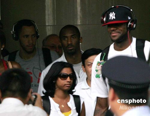 8月6日15時(shí)30分左右,美國(guó)“夢(mèng)八”男籃一行從上海飛抵北京首都機(jī)場(chǎng)備戰(zhàn)奧運(yùn)。圖為著名球星勒布朗·詹姆斯(右)和科比·布萊恩特(中)走出機(jī)場(chǎng)。中新社發(fā) 富田 攝