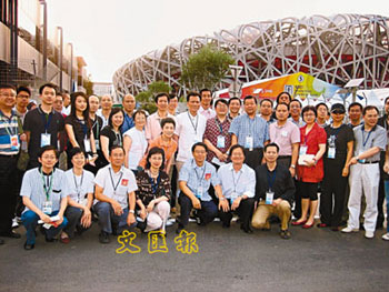 以香港文匯報社長張國良為團(tuán)長的香港新聞界訪京團(tuán)抵京率先察看奧運(yùn)之旅。圖為訪京團(tuán)成員在鳥巢前合照。(圖片來源:文匯報)