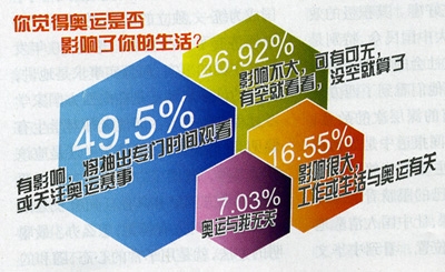“你覺得奧運(yùn)是否影響了你的生活?”問卷調(diào)查結(jié)果顯示,66.05%的受調(diào)查者認(rèn)為有影響或影響較大。其中表示“有影響,將抽出專門時間觀看或關(guān)注奧運(yùn)賽事”的占受調(diào)查者49.5%(2228票),表示“影響很大,工作或生活與奧運(yùn)有關(guān)”的占受調(diào)查者16.55%(745票)。