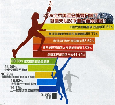 奧運(yùn)會開幕在即,公眾最關(guān)心、最擔(dān)心、最期待什么?最愛看的比賽項目是什么?中國人將以怎樣的方式和心態(tài)關(guān)注奧運(yùn)賽事?圍繞這些問題,2008年7月,人民論壇雜志社聯(lián)合新浪網(wǎng)以“北京奧運(yùn),公眾關(guān)注什么”為題進(jìn)行了網(wǎng)絡(luò)調(diào)查。該調(diào)查一推出,即受到網(wǎng)友廣泛關(guān)注,并轉(zhuǎn)貼到其他網(wǎng)站調(diào)查區(qū)、討論區(qū)等。初步統(tǒng)計了受調(diào)查人數(shù)4500人。此外,人民論壇記者隨機(jī)采訪調(diào)查了部分北京市民。