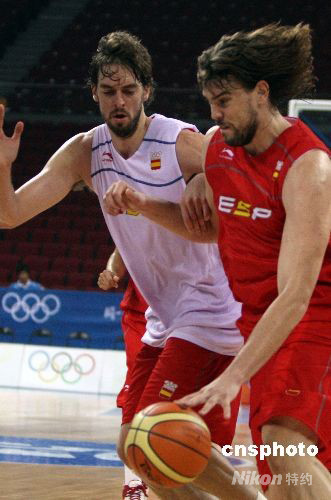 8月7日,世界冠軍西班牙男籃在北京奧運(yùn)會(huì)籃球比賽館——五棵松籃球進(jìn)行賽前的最后一場(chǎng)熱身訓(xùn)練,效力于NBA洛杉磯湖人隊(duì)的超級(jí)球星保羅·加索爾(左)與弟弟馬克·加索爾率領(lǐng)球隊(duì)演練戰(zhàn)術(shù)。中新社發(fā) 任晨鳴 攝