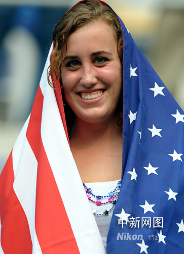 圖:美國(guó)女球迷身披國(guó)旗助威