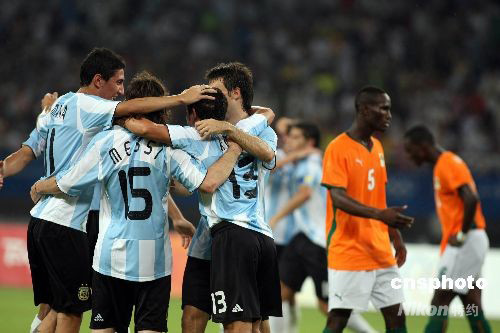 8月7日,北京奧運會上海足球分賽場男足預(yù)賽,在衛(wèi)冕冠軍阿根廷隊對陣科特迪瓦的比賽中, 阿根廷以2:1戰(zhàn)勝對手迎來開門紅。 中新社發(fā) 湯彥俊 攝