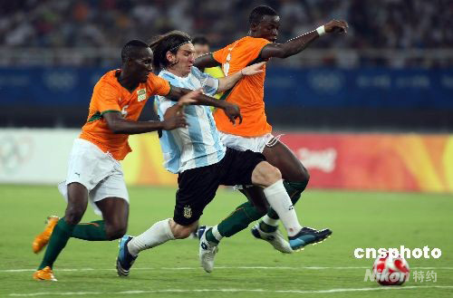 8月7日,北京奧運(yùn)會(huì)上海足球分賽場(chǎng)男足預(yù)賽,在衛(wèi)冕冠軍阿根廷對(duì)陣科特迪瓦的比賽中, 阿根廷以2:1取勝迎來(lái)開(kāi)門紅,球星梅西(MESSI Lionel)為阿根廷攻入本屆奧足賽首粒進(jìn)球。圖為梅西帶球從人縫中突破。 中新社發(fā) 湯彥俊 攝