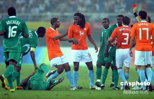 圖:奧運(yùn)男足荷蘭14號隊(duì)員被紅牌罰下場 (3)