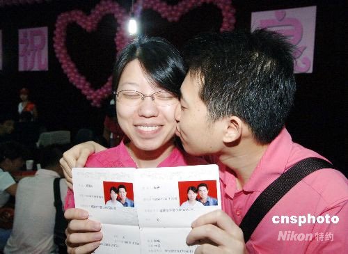 8月8日,北京奧運會開幕日,來自中國民政部的消息顯示,中國各地將有數(shù)十萬對新人喜結良緣,創(chuàng)下新中國成立以來日登記量最大的婚姻登記高峰。圖為8月8日早晨8點8分,福州一對新人領到結婚證書后深情相吻。中新社發(fā) 劉可耕 攝