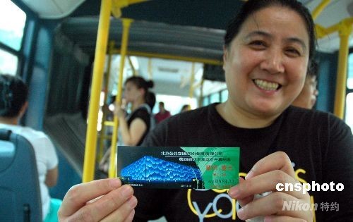 8月8日,北京奧運(yùn)會(huì)開(kāi)幕日,北京公交集團(tuán)公司在所屬線路車上發(fā)售奧運(yùn)會(huì)開(kāi)幕紀(jì)念公交車票。據(jù)了解,奧運(yùn)公交紀(jì)念車票分四種票樣,在不同線路車上發(fā)售,因數(shù)量有限,紀(jì)念票售完后仍出售現(xiàn)行普通票。圖為乘客高興地展示買到的奧運(yùn)紀(jì)念車票。中新社發(fā) 張雙雙 攝