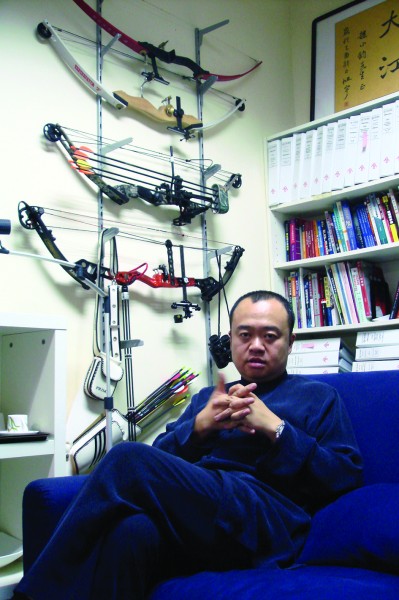 走進(jìn)趙小鈞在上海的辦公室,初看之下,陳設(shè)有些雜亂。電腦桌上方隨意粘貼的,有他不同時期的照片和肖像漫畫;墻壁上也是滿滿當(dāng)當(dāng),西洋畫挨著中國書法,弓箭望著書櫥,琳瑯滿目。
