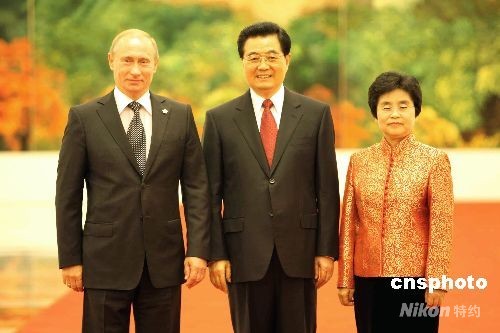 8月8日中午,中國國家主席胡錦濤和夫人劉永清在北京人民大會堂為出席北京奧運(yùn)會的貴賓舉行歡迎宴會。圖為胡錦濤夫婦歡迎俄羅斯總理普京。中新社發(fā) 任海霞 攝