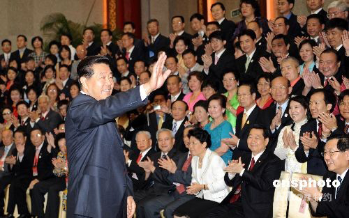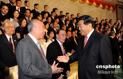 8月8日,中共中央政治局常委、全國(guó)政協(xié)主席賈慶林在北京釣魚臺(tái)國(guó)賓館會(huì)見出席北京奧運(yùn)開幕式的近200位華人華僑代表。中新社發(fā) 廖攀 攝