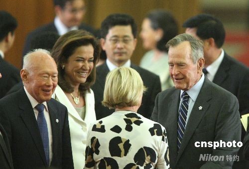 8月8日,中國(guó)國(guó)家主席胡錦濤在北京人民大會(huì)堂宴會(huì)廳為出席北京奧運(yùn)會(huì)的貴賓舉行歡迎宴會(huì)。圖為新加坡內(nèi)閣資政李光耀、美國(guó)前總統(tǒng)老布什出席北京奧運(yùn)歡迎宴會(huì)。中新社發(fā) 廖文靜 攝