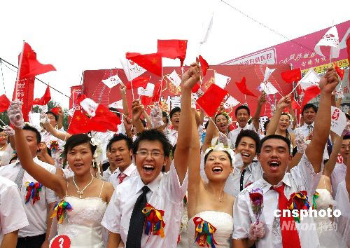 2008年8月8日,山東濱州50對新人齊聚廣場,手舉奧運(yùn)旗幟高呼“中國加油、奧運(yùn)加油”,與祖國同慶,與奧運(yùn)同慶。中新社發(fā) 梁寶海 攝