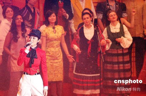 八月八日,香港特區(qū)政府在沙田賽場(chǎng)舉行盛大歡迎晚會(huì)上,歡迎來(lái)自世界各地參加奧運(yùn)馬術(shù)比賽的參賽隊(duì)伍。圖為著名歌星陳慧琳在晚會(huì)上高歌。 中新社發(fā) 洪少葵 攝