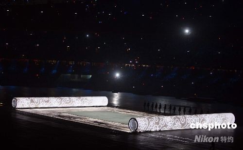 8月8日晚,第二十九屆奧林匹克運動會在北京開幕。由中國著名電影導演張藝謀指導的北京奧運會開幕式文藝演出節(jié)目中的核心部分——《美麗的奧林匹克》,全部內(nèi)容圍繞一幅“中國古代畫卷”卷軸的開啟展開。中新社發(fā) 任晨鳴 攝