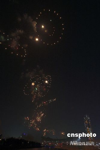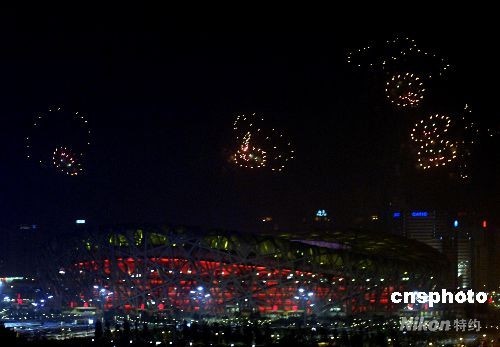 八月八日晚,第29屆奧林匹克運動會在北京開幕。絢麗煙花綻放北京夜空。圖為鳥巢上空顯現(xiàn)“笑臉”煙花。