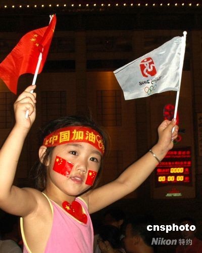 8月8日晚8時(shí),北京天安門廣場(chǎng)東側(cè)奧運(yùn)倒計(jì)時(shí)牌歸零。在天安門廣場(chǎng)為北京奧運(yùn)狂歡的一位小女孩拿著中國(guó)國(guó)旗為北京奧運(yùn)加油。中新社發(fā) 張雙雙 攝