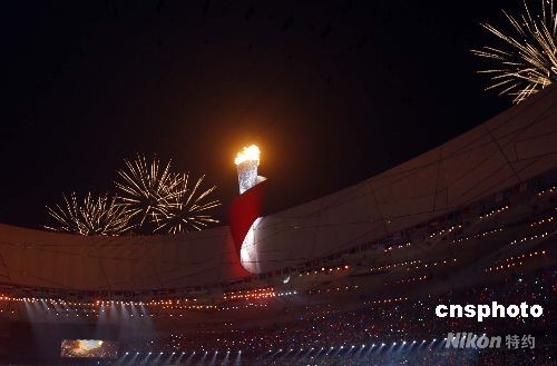 8月8日,第29屆夏季奧運(yùn)會(huì)在北京奧林匹克公園內(nèi)的國(guó)家體育場(chǎng)“鳥(niǎo)巢”舉行。李寧點(diǎn)燃北京奧運(yùn)會(huì)主火炬,奧運(yùn)圣火在鳥(niǎo)巢上空熊熊燃燒。中新社發(fā) 杜洋 攝