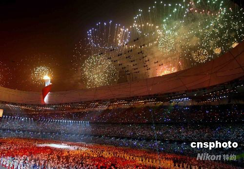 8月8日,第29屆夏季奧運會在北京奧林匹克公園內(nèi)的國家體育場“鳥巢”舉行。李寧點燃北京奧運會主火炬。在空中的“五環(huán)煙花”映襯下,奧運圣火在鳥巢上空熊熊燃燒。中新社發(fā) 任晨鳴 攝
